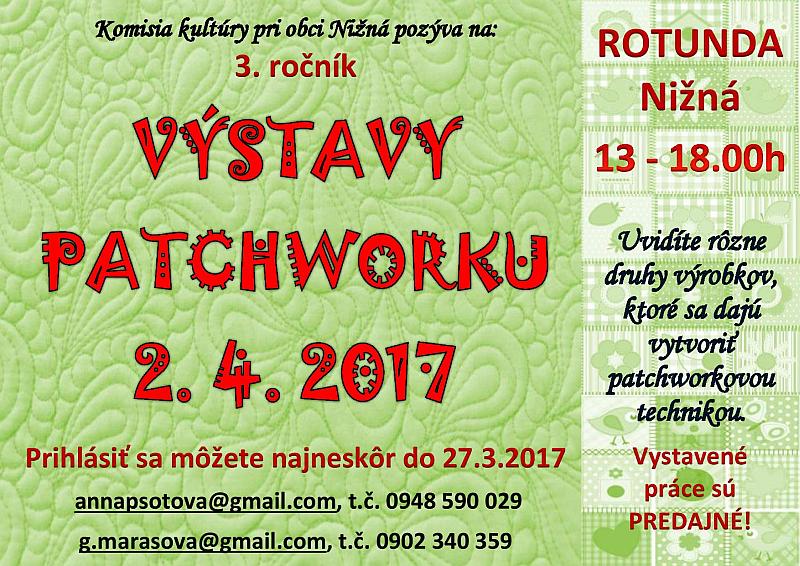 Komisia kultúry v spolupráci s obcou Nižná, pozýva 2.4.2017, všetkých obdivovateľov tejto techniky, na 3. ročník výstavy patchworkových výrobkov, ktorá bude prebiehať v priestoroch Rotundy v Nižnej, v čase od 13.00 hod. do 18.00 hod. Vystavené výrobky môžete nielen obdivovať, ale si ich môžete odniesť aj so sebou. Vystavované práce sú PREDAJNÉ!