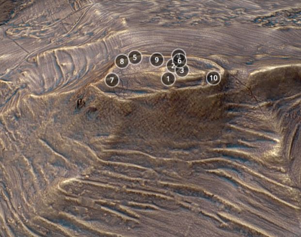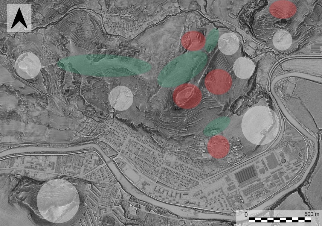 Sídliská (červené) objavené počas nových výskumov Oravského múzea od roku 2017. Zelená –polohy, ktoré mohli slúžiť ako pasienky/polia (našli sa tam drobné črepy); biele – polohy bez archeologických nálezov, ktoré neslúžili pre trvalé osídlenie. Autor: B. Lofajová Danielová.