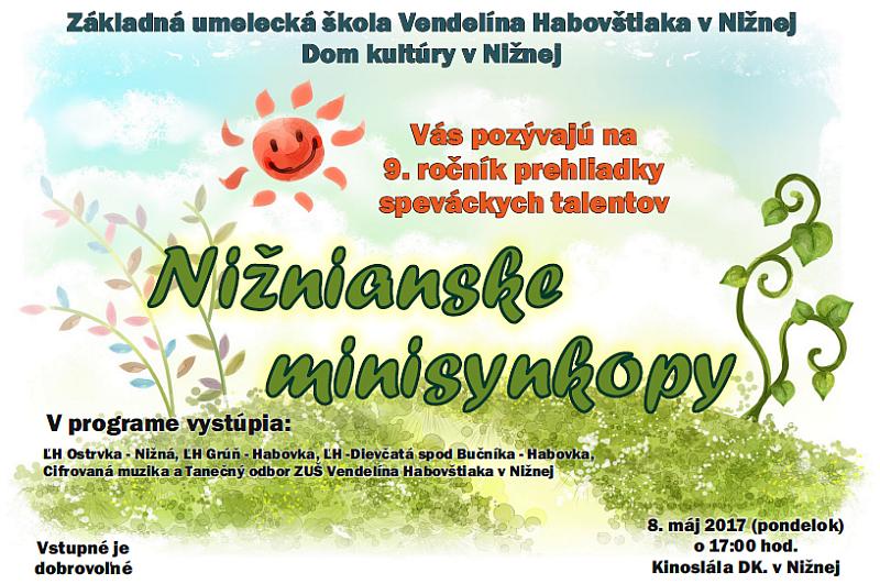 9. ročník prehliadky speváckych talentov Nižnianske minisynkopy budú v pondelok 8. mája 2017 o 17:00 hod. v kinosále Domu kultúry v Nižnej.