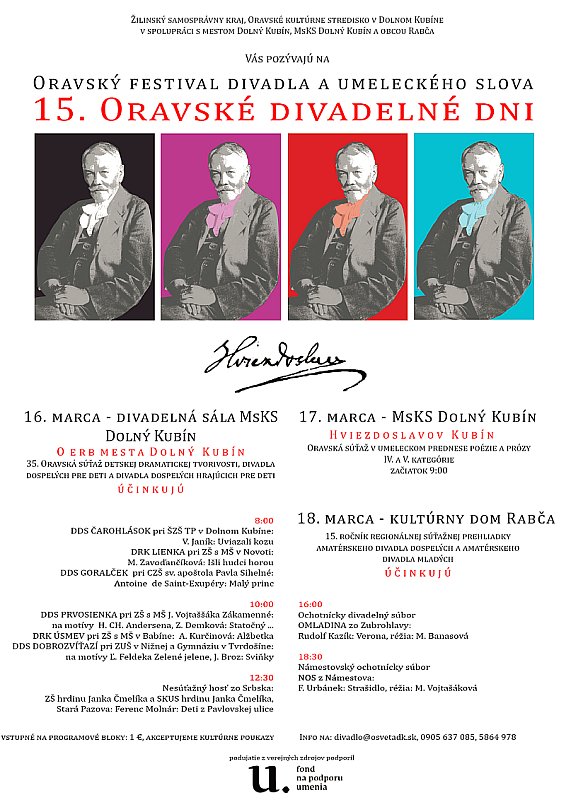 Oravský festival divadla a umeleckého slova, ktorý sa tento rok uskutoční v dňoch 16. - 18. marca 2017 v Mestskom kultúrnom stredisku v Dolnom Kubíne a v Kultúrnom dome v Rabči, ponúka divákom deväť inscenácií v podaní regionálnych divadelných a recitačných súborov. V programe festivalu sú obsiahnuté tri regionálne súťaže…
