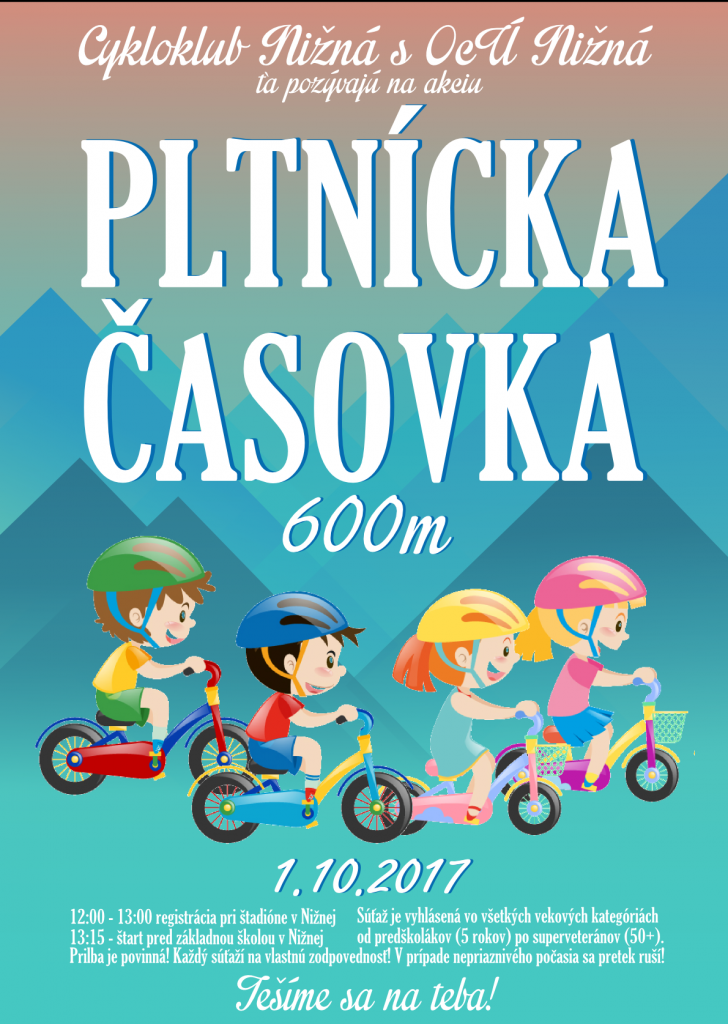 Cykloklub Nižná Vás pozýva na Pltnícku časovku - 600m, ktorá sa uskutoční túto nedeľu 1.10.2017 so začiatkom o 12:00 hodine.