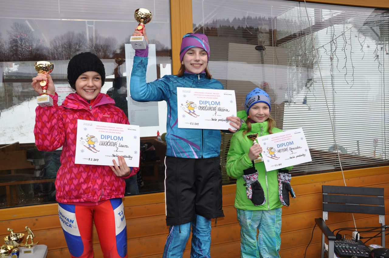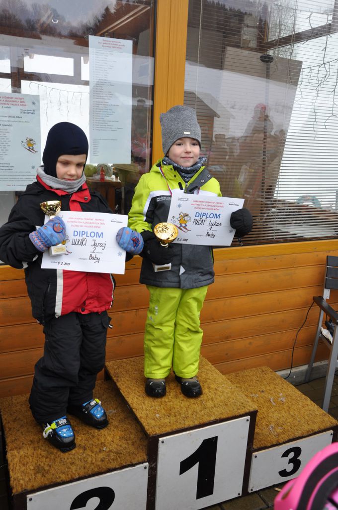 Štartujeme presne podľa plánu a na detskej trati postupne štartuje až 45 našich najmenších pretekárov od 3 do 7 rokov, ktorí s veľkým zápalom bojujú o víťazstvo. Nasleduje štart na riadnej pretekárskej trati, kde už treba fakt zabrať. Na trati je potrebné zdolať 25 lyžiarskych brán. Tak ako predošlé podujatia aj tento rok celú akciu skvele moderuje Martina Labdíková. Profesionálne odvedené meranie výsledných časov bez problémov zvláda časomerač Marcel Pardek. Preteky majú rýchly spád a my pomedzi to chystáme ešte tradičné preteky pre rodiny pod názvom Oco, mama a ja. Už o krátky čas sa na štarte pripravuje 20 rodinných dvojíc. Dieťa štartuje na detskej trati a pomedzi bránky prichádza do cieľa. V tej chvíli vyštartuje rodič z cieľa a uteká v snežniciach okolo bránok na štart. Naoko ľahká disciplína, ale my rodičia sa zhodujeme, že sranda je len po 3 bránku a potom je to už boj :-) A prichádza vyhodnotenie. Začíname odmeňovaním najmladšieho lyžiara, lyžiarky – ešte nemajú ani 4 roky – a snowboardistu – ten má necelých 6 rokov. Kategória Baby, Superbaby, Mladšie predžiačky,... Pribudlo snowboardistov, ba aj dievčatá nazbierali odvahu a ukázali svoje schopnosti na tomto kuse dreva. Ako poslední stoja na stupňoch víťazov aj odvážni ockovia a mamky.